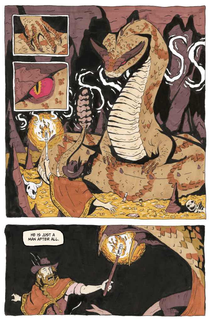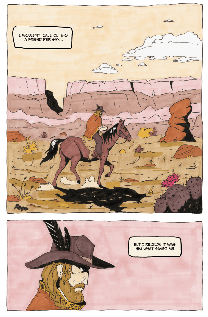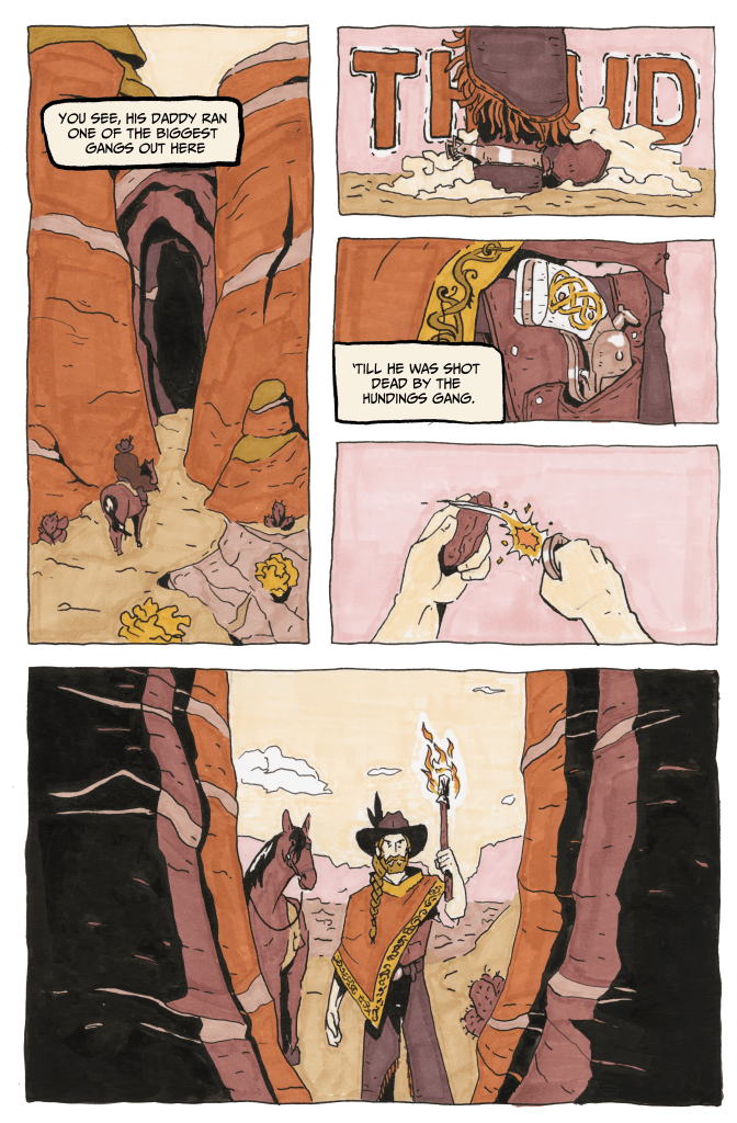 “Ol’ Sig and the Snake” is an 8-page short story for an anthology project with the Sequential Storytelling Society that has yet to be announced. Ol’ Sig is a Wild West retelling of the legend of Sigurd and Fafnir from the Volsung Saga of Iceland. This comic was made with dip pen and alcohol markers.