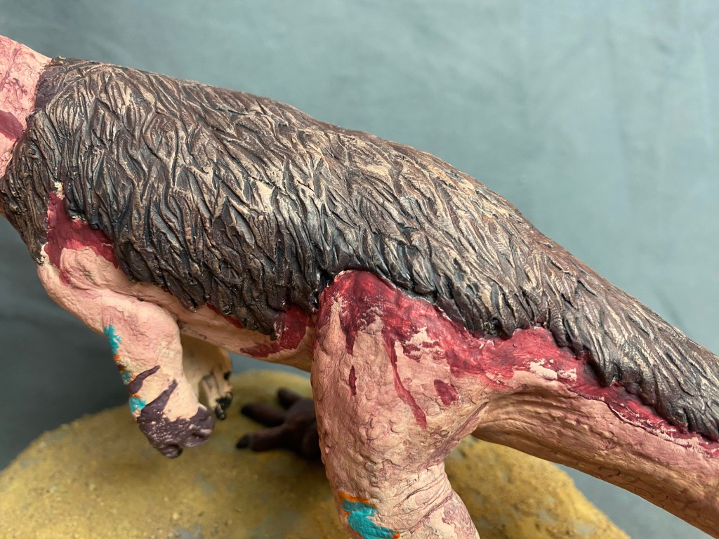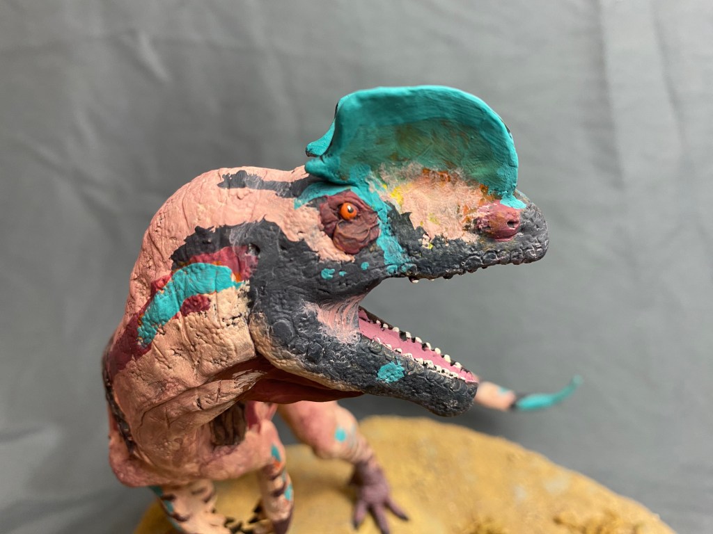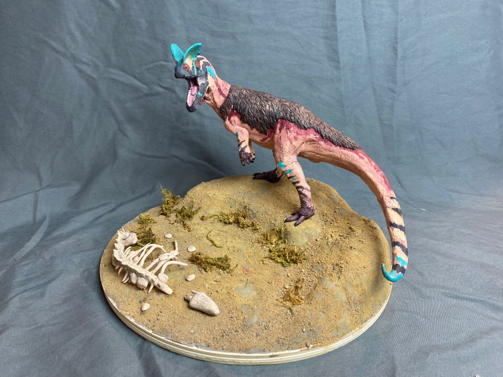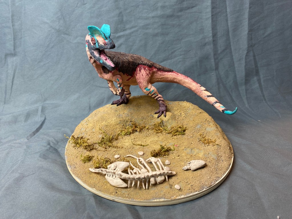 Hand-sculpted and painted polymer clay sculpture and diorama. This diorama depicts a speculative scene from the environment of the Kayenta Formation from the south-western United States. It depicts a Dilophosaurus standing atop a hardened dune looking over the half-buried skeleton of a Scelidosaurus.