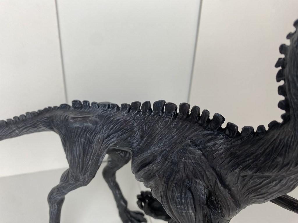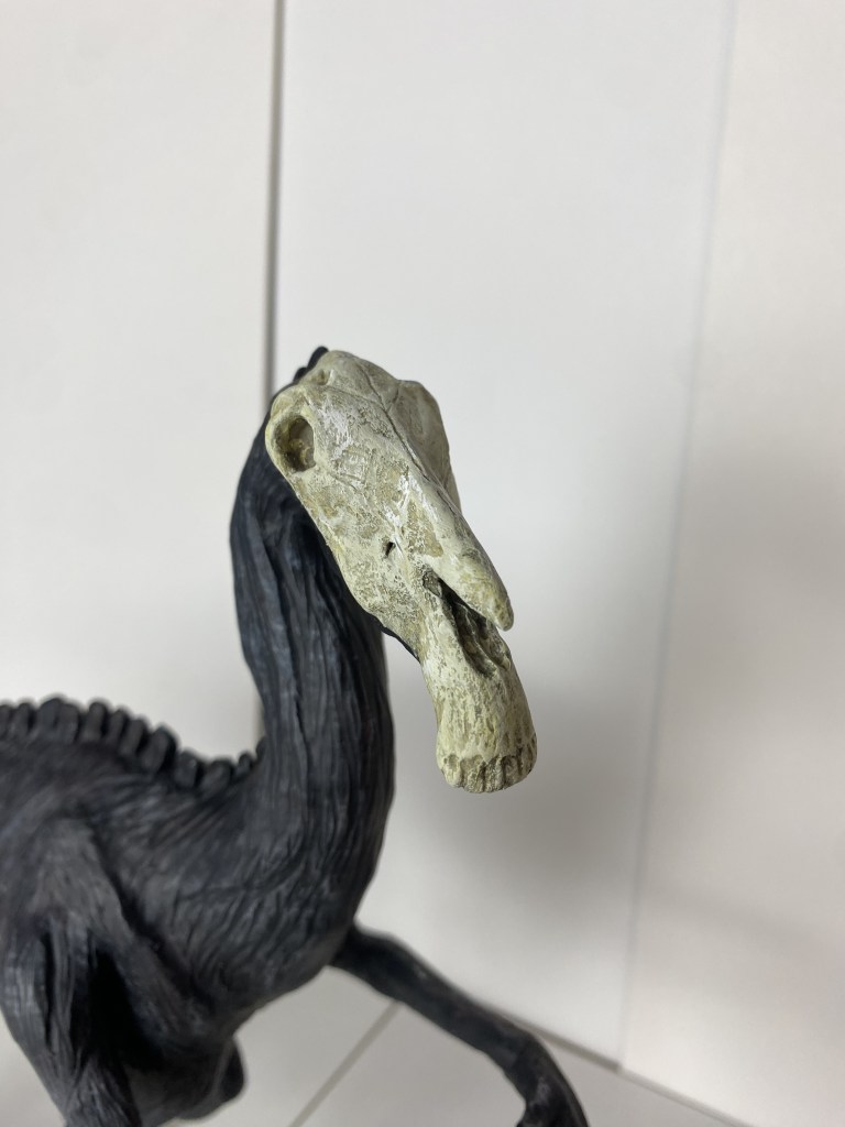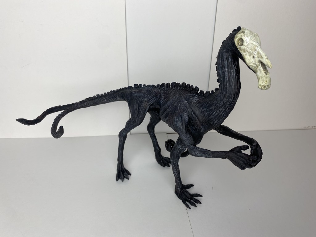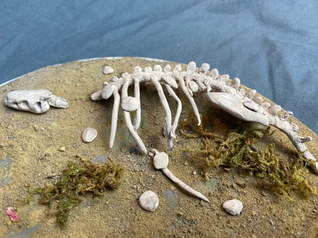 Hand-sculpted and painted polymer clay sculpture and diorama. This diorama depicts a speculative scene from the environment of the Kayenta Formation from the south-western United States. It depicts a Dilophosaurus standing atop a hardened dune looking over the half-buried skeleton of a Scelidosaurus.